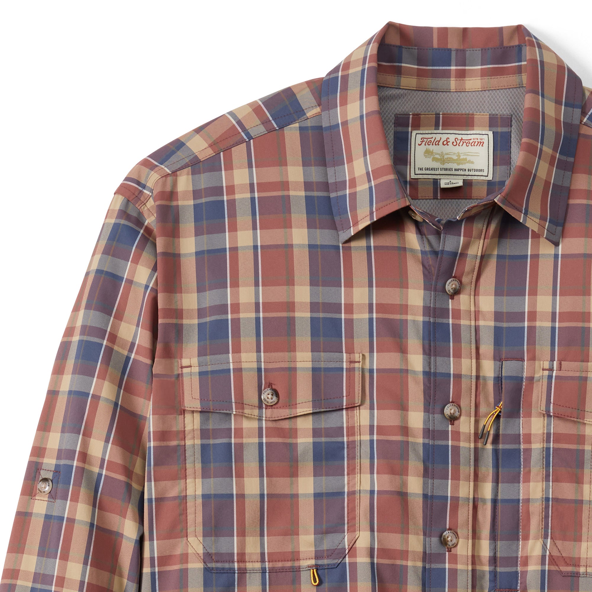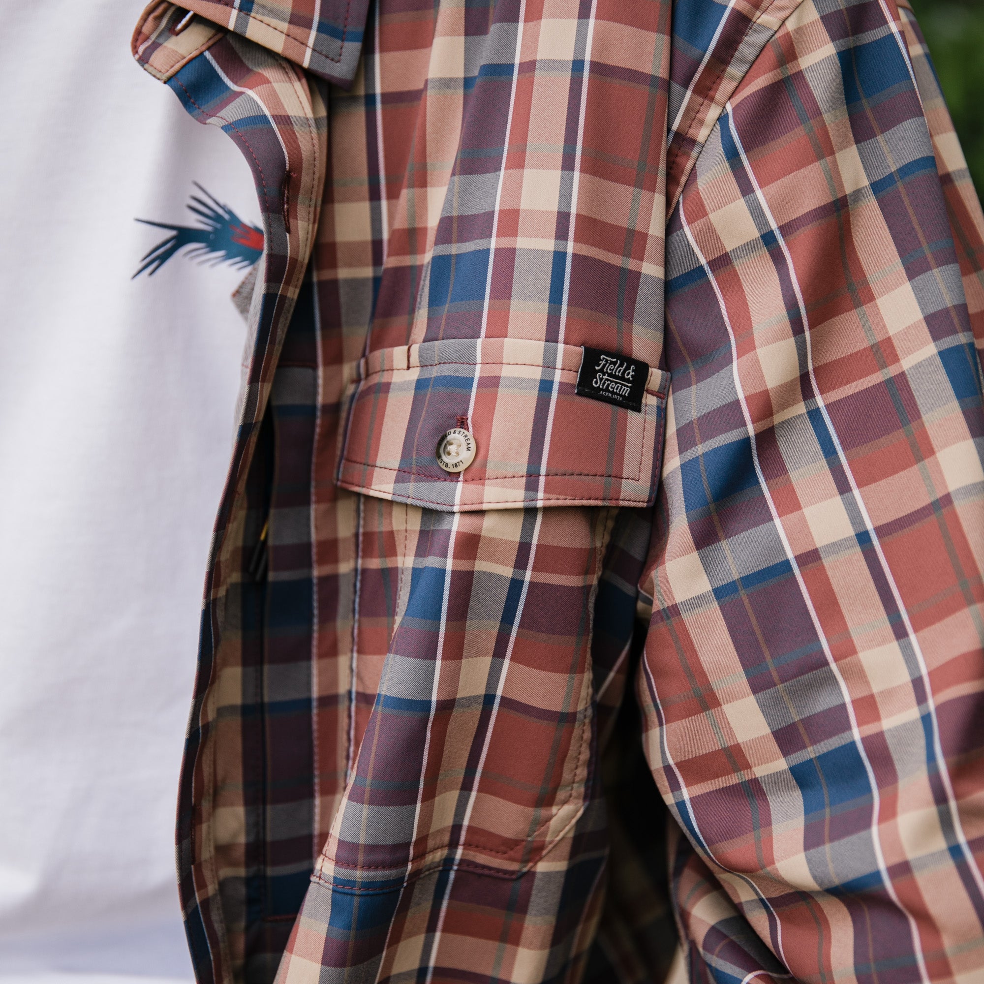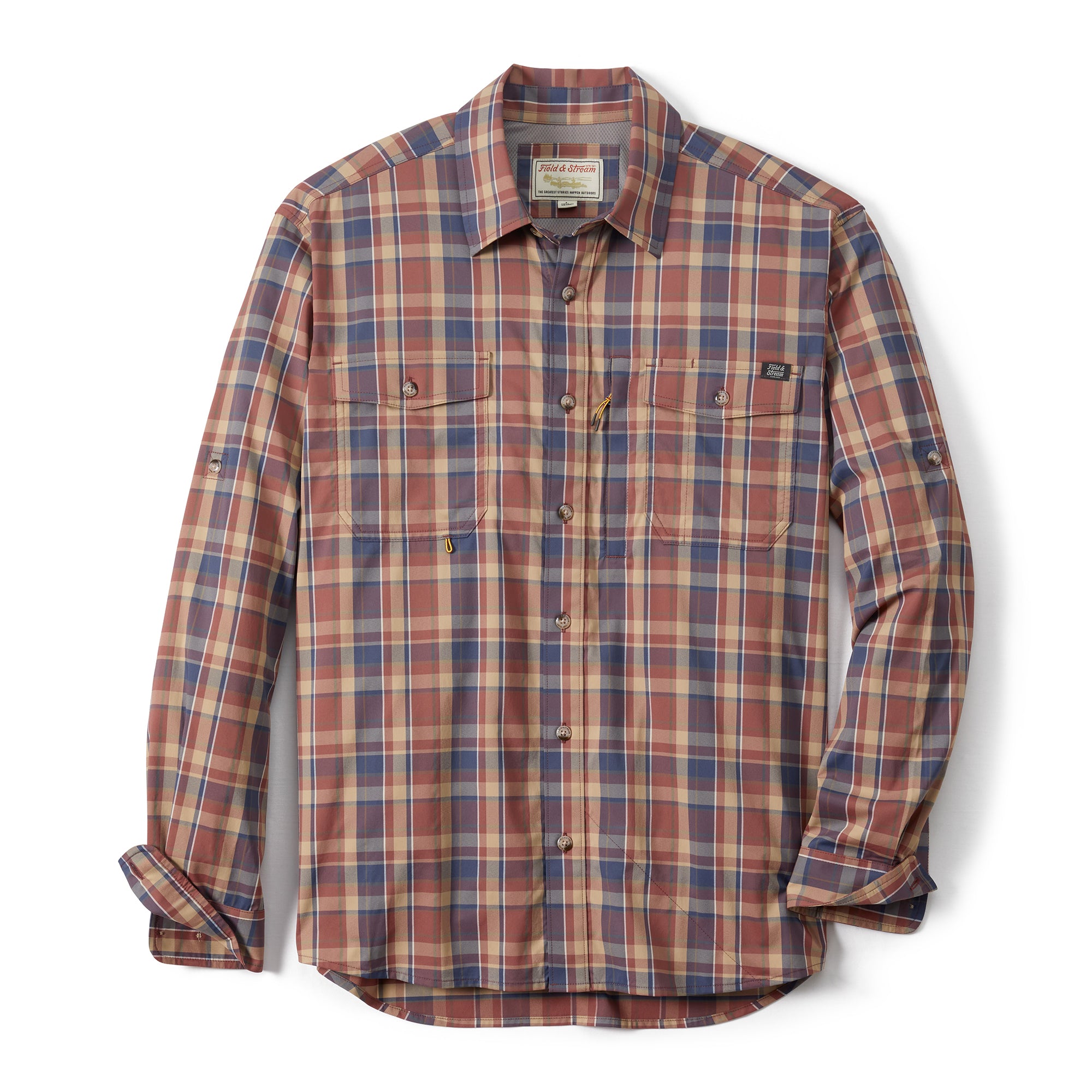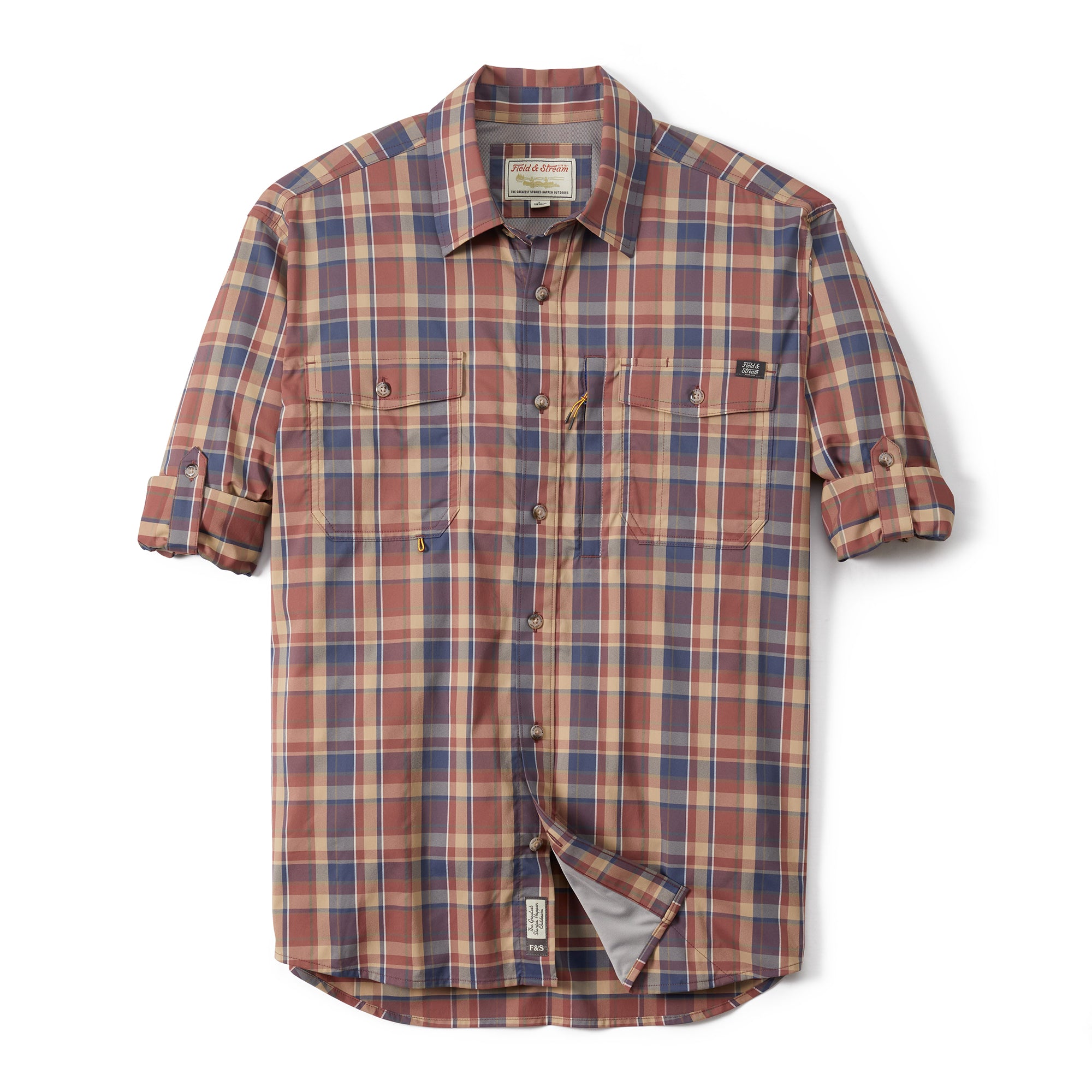Good looking and ready for a day out on the water, our Field & Stream button-down long-sleeve, woven shirt is designed for the outdoorsman in our own vintage patterns. UPF 50, temperature regulating materials, made of 2-way, stretch woven nylon for extra durability and reduced shrinkage, Spandex for added stretch and recovery. Custom fit for ease of movement, two buttoned-flap chest pockets, hidden zipper pocket for stashing small items securely, loop on right pocket for accessories and pencil/sunglass slot. The long sleeves convert to short sleeves with a roll and a button. The vented flying V back yoke gives you a “cool” western twist and added mobility, vented for extra airflow. Best of all, this shirt has a handy, built-in microfiber cleaning cloth at the bottom hem for sunglasses or binoculars.