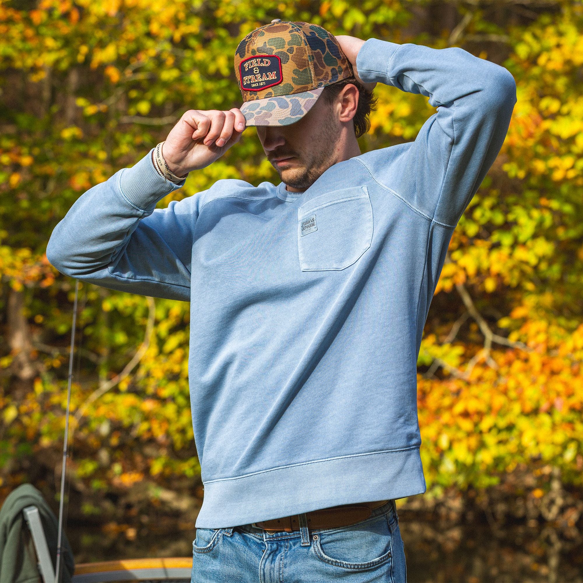 Built for everyday comfort with a timeless feel, the Field & Stream Men’s Holloa French Terry Crew delivers relaxed warmth in a clean, versatile silhouette. Made from a garment-dyed cotton blend, the French terry fabric feels soft and broken-in from the first wear while developing rich character over time. A true-to-size, relaxed fit makes it easy to layer or wear on its own, and raglan sleeve construction enhances mobility while adding a subtle heritage athletic look. Finished with a simple chest pocket and Field & Stream labeling, this crew reflects 150 years of craftsmanship rooted in comfort, durability, and outdoor style.