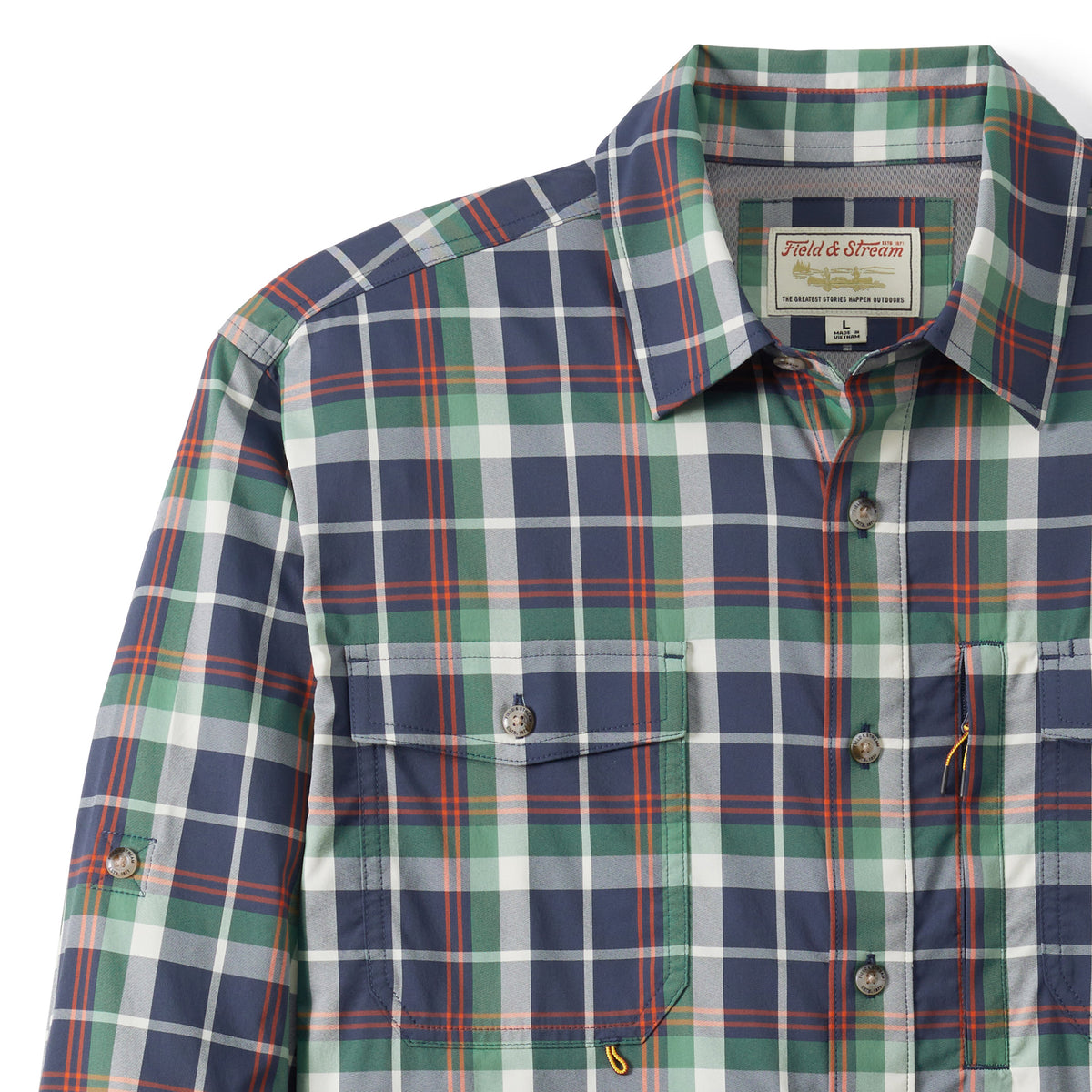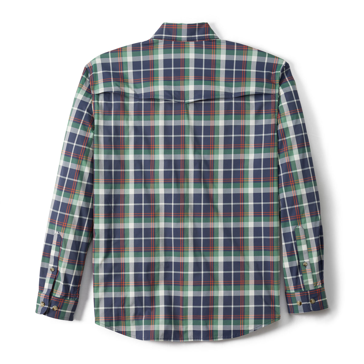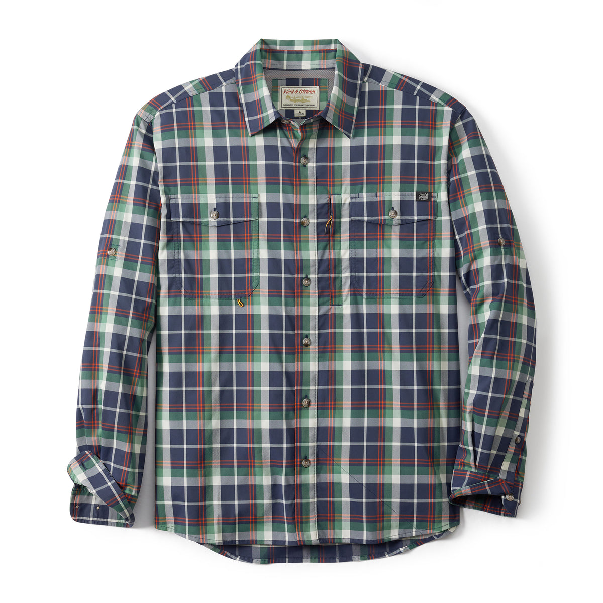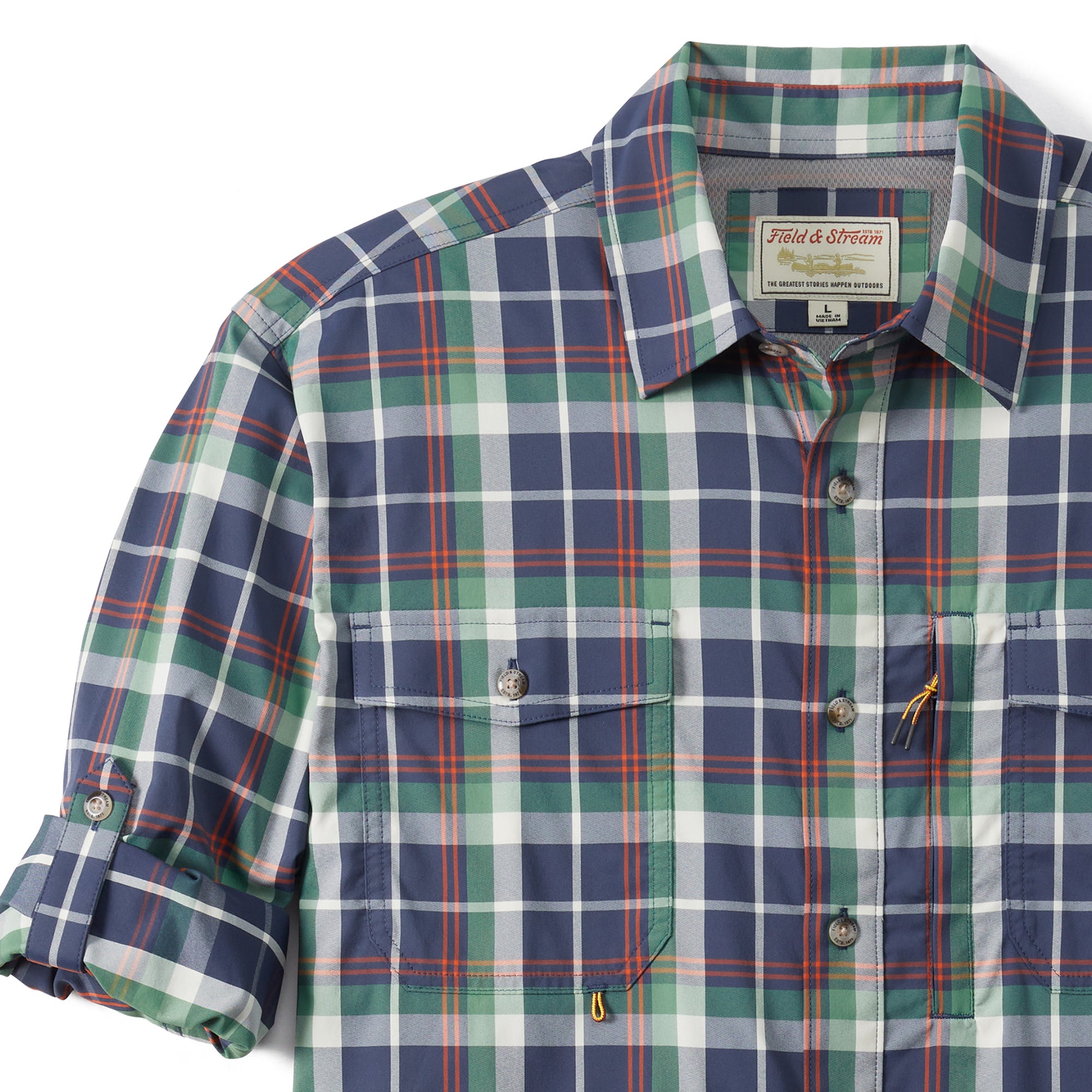 Good looking and ready for a day out on the water, our Field & Stream button-down long-sleeve, woven shirt is designed for the outdoorsman in our own vintage patterns. UPF 50, temperature regulating materials, made of 2-way, stretch woven nylon for extra durability and reduced shrinkage, Spandex for added stretch and recovery. Custom fit for ease of movement, two buttoned-flap chest pockets, hidden zipper pocket for stashing small items securely, loop on right pocket for accessories and pencil/sunglass slot. The long sleeves convert to short sleeves with a roll and a button. The vented flying V back yoke gives you a “cool” western twist and added mobility, vented for extra airflow. Best of all, this shirt has a handy, built-in microfiber cleaning cloth at the bottom hem for sunglasses or binoculars.