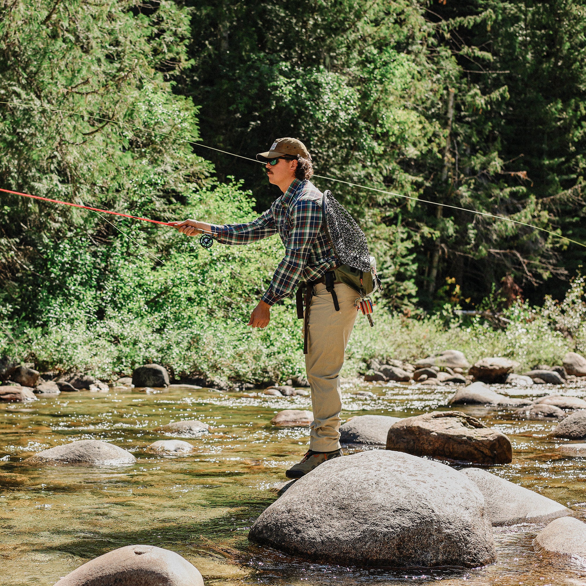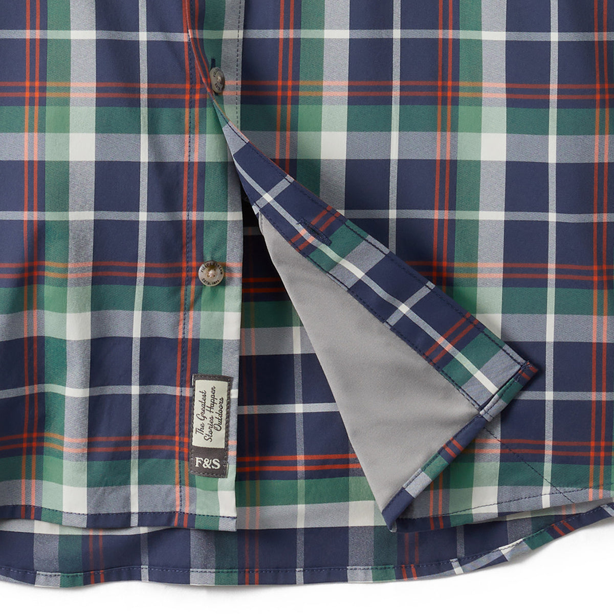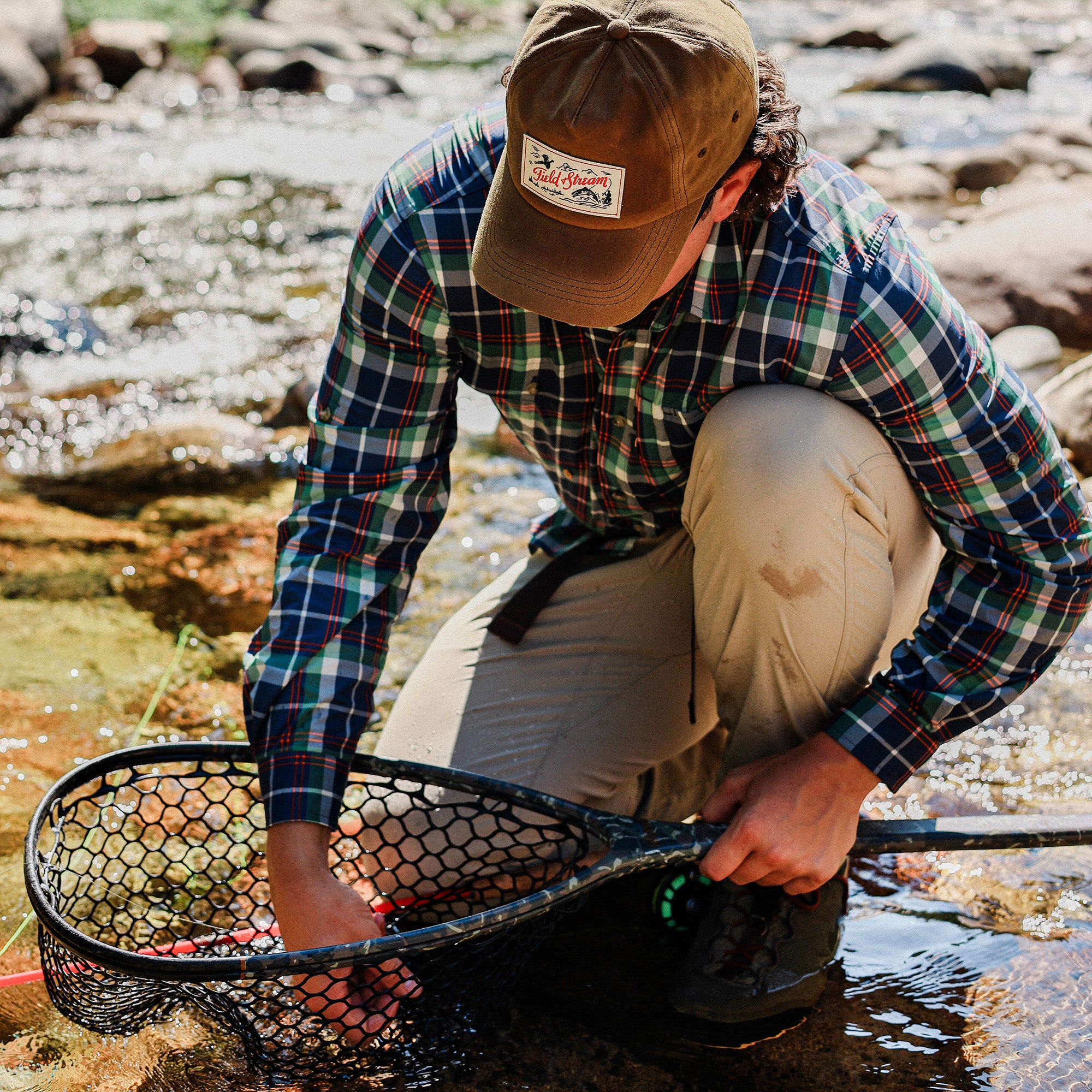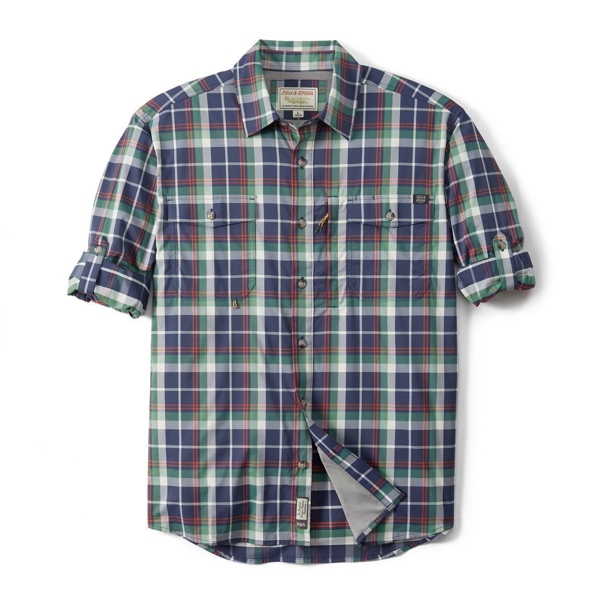 Good looking and ready for a day out on the water, our Field & Stream button-down long-sleeve, woven shirt is designed for the outdoorsman in our own vintage patterns. UPF 50, temperature regulating materials, made of 2-way, stretch woven nylon for extra durability and reduced shrinkage, Spandex for added stretch and recovery. Custom fit for ease of movement, two buttoned-flap chest pockets, hidden zipper pocket for stashing small items securely, loop on right pocket for accessories and pencil/sunglass slot. The long sleeves convert to short sleeves with a roll and a button. The vented flying V back yoke gives you a “cool” western twist and added mobility, vented for extra airflow. Best of all, this shirt has a handy, built-in microfiber cleaning cloth at the bottom hem for sunglasses or binoculars.