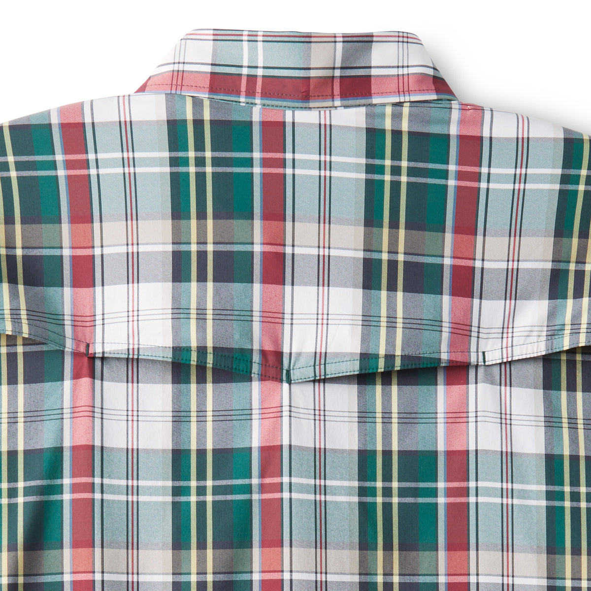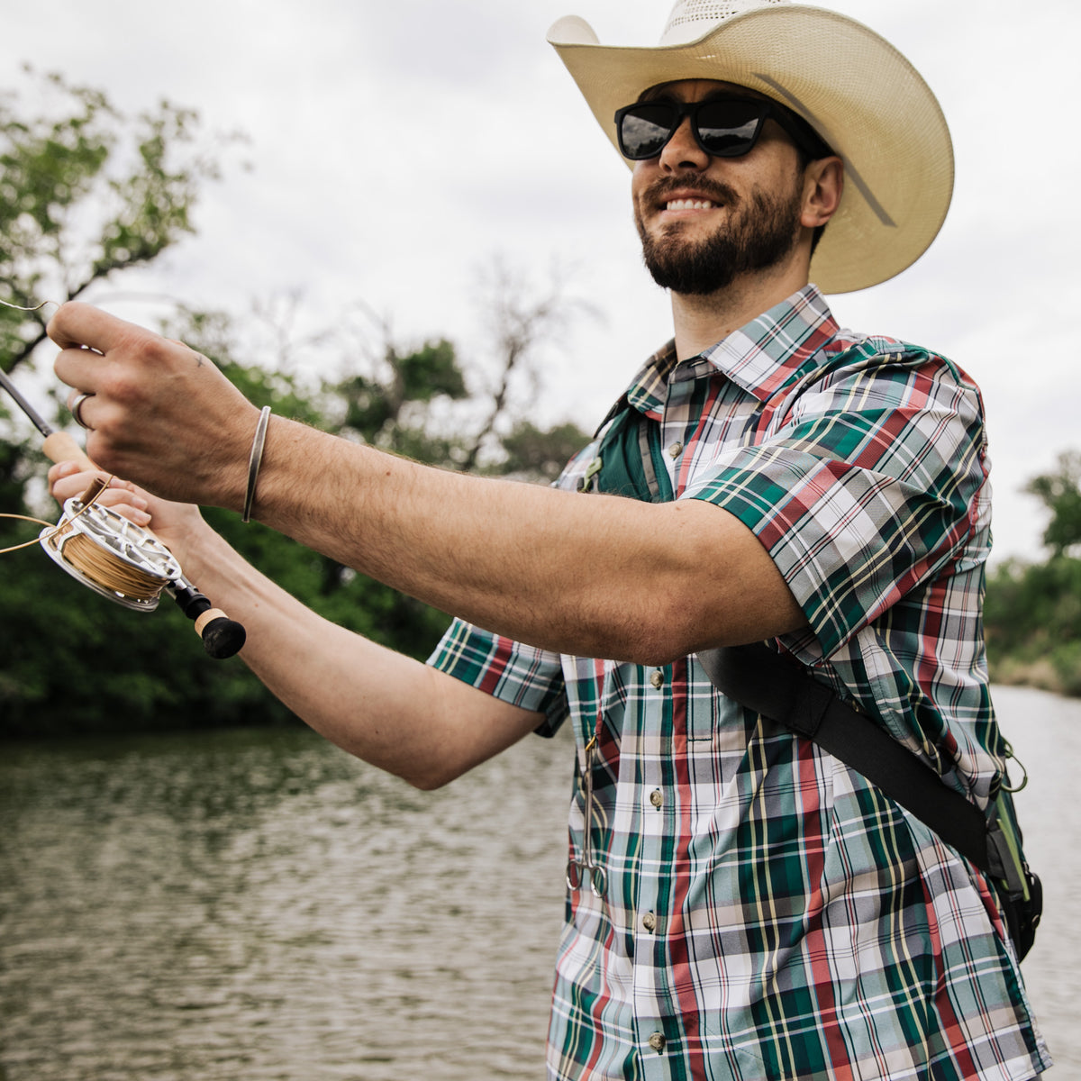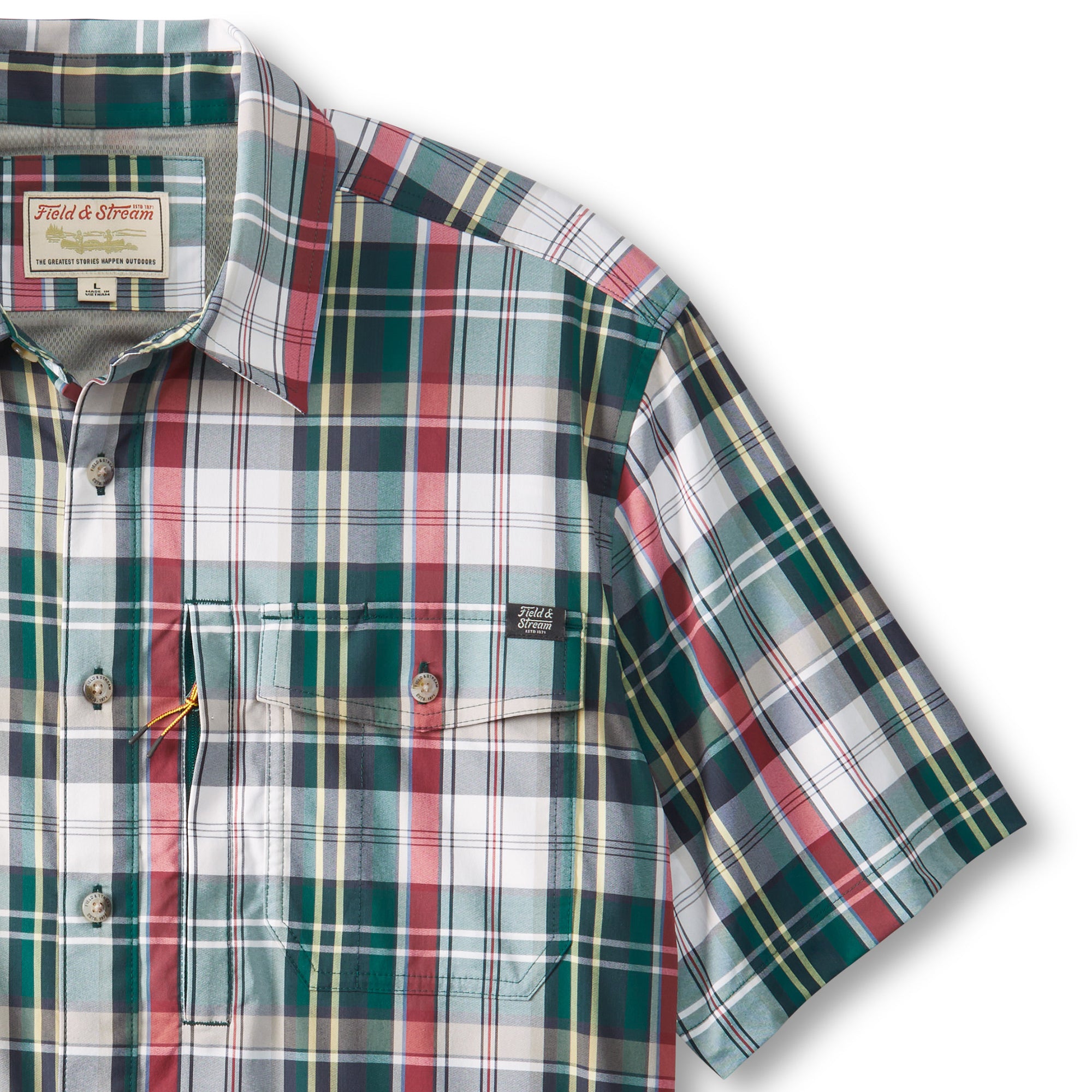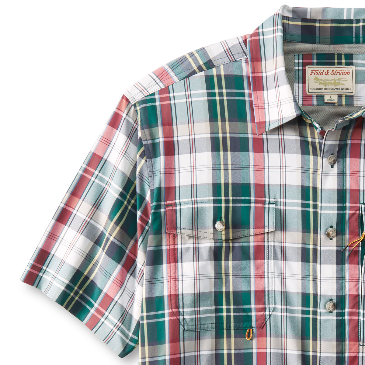 At Field & Stream, we’re always looking for the perfect short sleeve performance fishing shirt, so we designed one for outdoorsmen like us with a custom fit for easy movement. UPF 50, temperature regulating materials, 2-way stretch, woven nylon for extra durability and reduced shrinkage, Spandex for added stretch and recovery. Two chest pockets with flaps that button to keep your essentials close and secure, hidden zipper pocket to safely store small essentials and pencil/sunglass slot. The vented flying V back yoke adds mobility and a nod to the west and is vented for added airflow. Built-in microfiber cleaning cloth at the hem for sunglasses or binoculars.