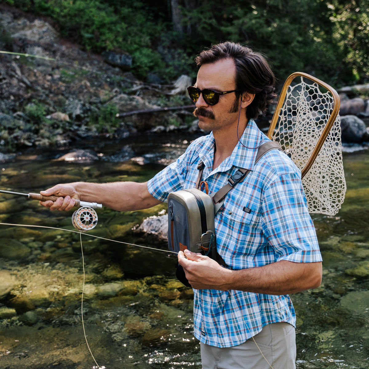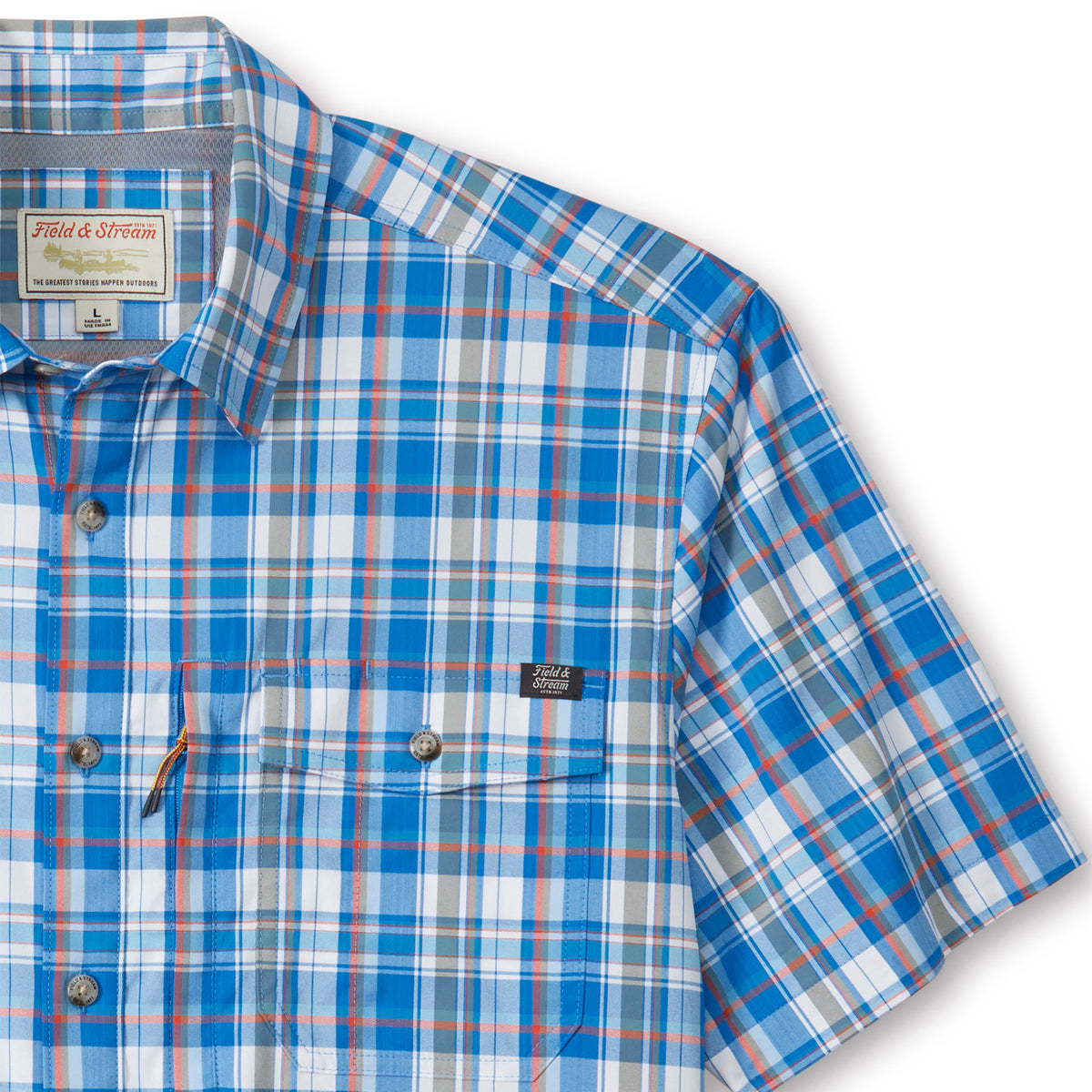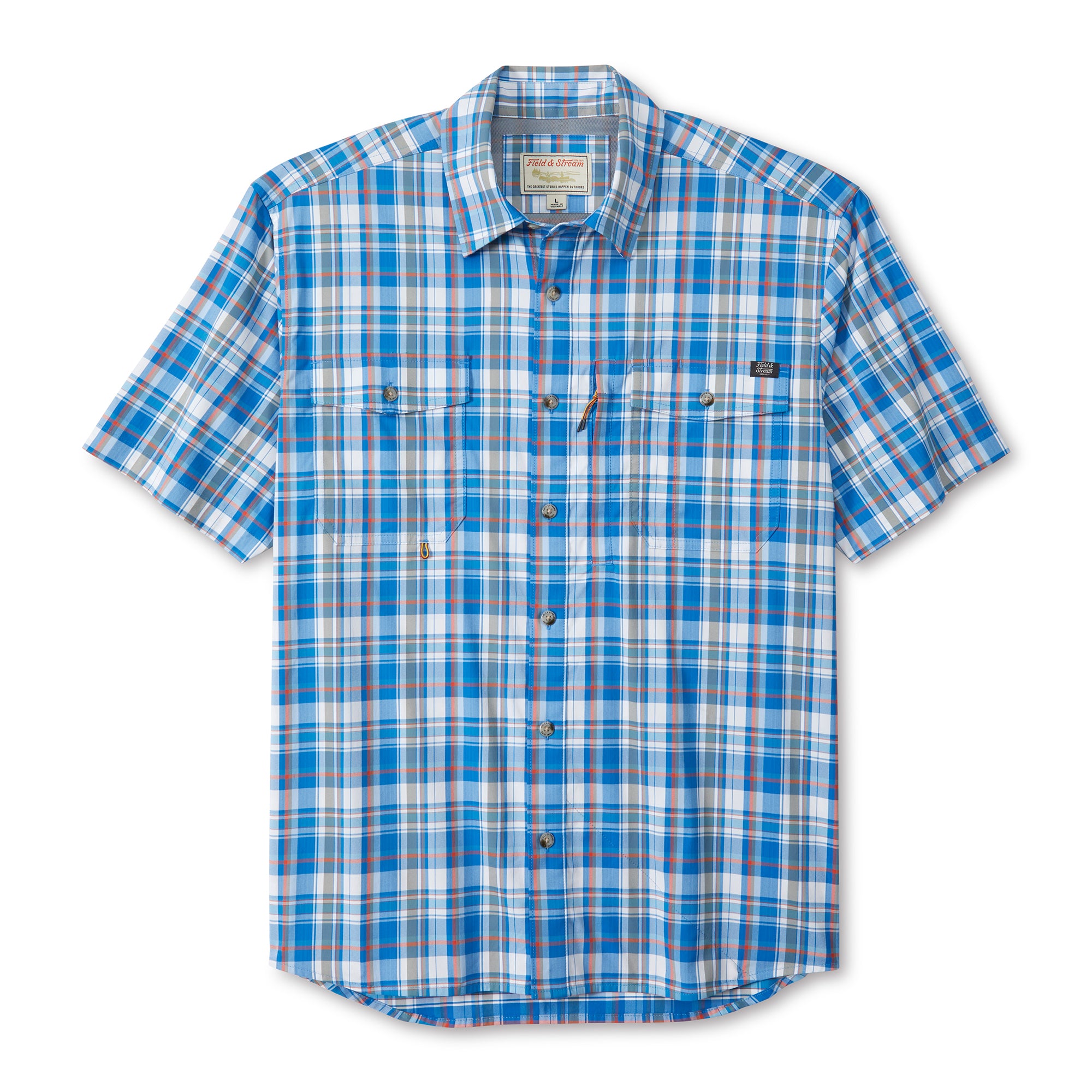 At Field & Stream, we’re always looking for the perfect short sleeve performance fishing shirt, so we designed one for outdoorsmen like us with a custom fit for easy movement. UPF 50, temperature regulating materials, 2-way stretch, woven nylon for extra durability and reduced shrinkage, Spandex for added stretch and recovery. Two chest pockets with flaps that button to keep your essentials close and secure, hidden zipper pocket to safely store small essentials and pencil/sunglass slot. The vented flying V back yoke adds mobility and a nod to the west and is vented for added airflow. Built-in microfiber cleaning cloth at the hem for sunglasses or binoculars.