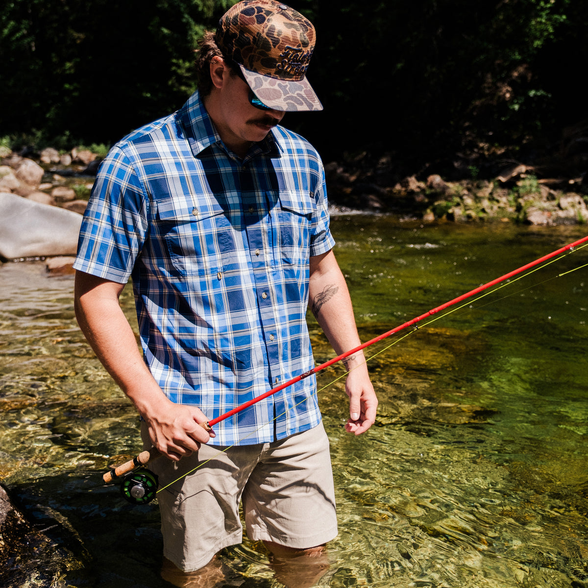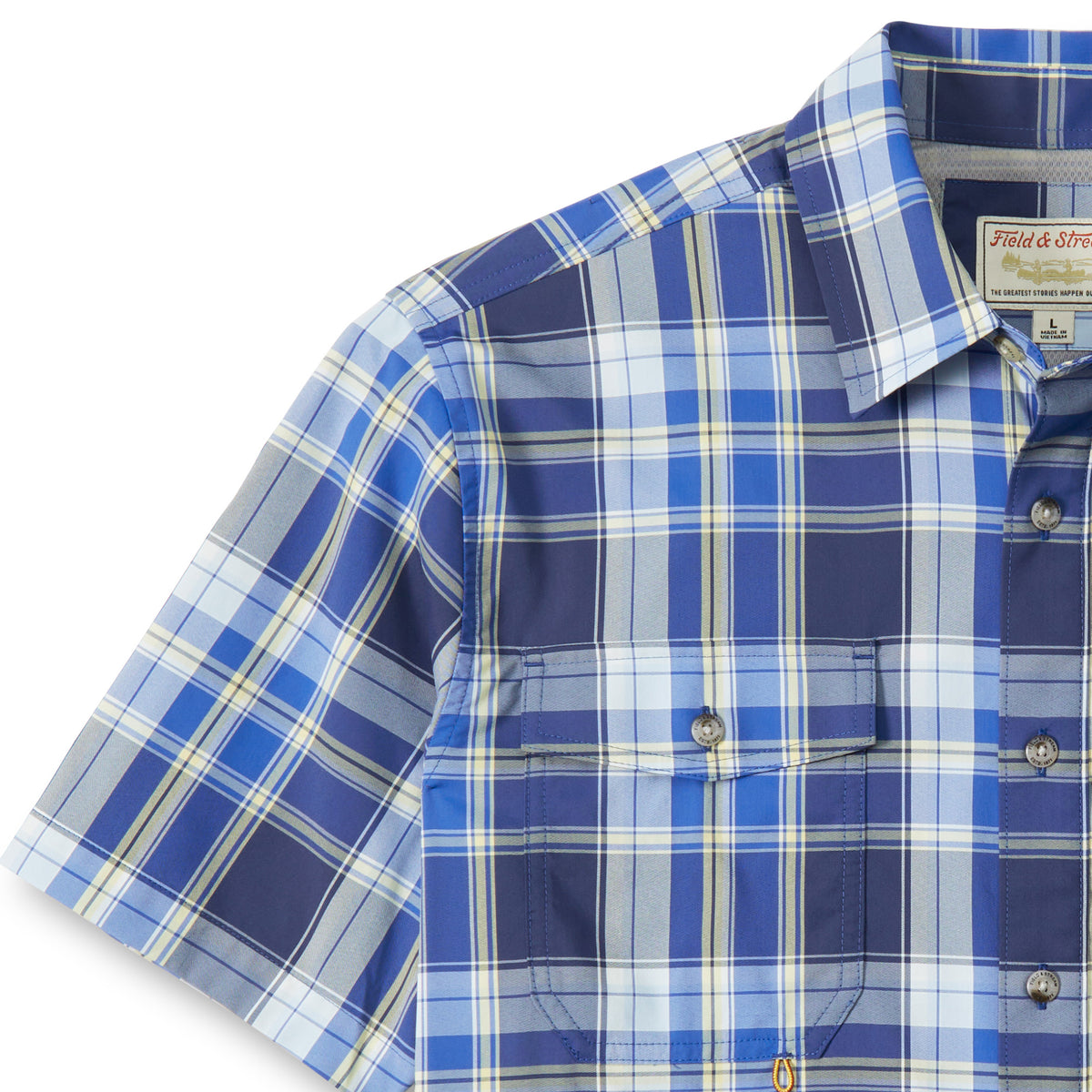 At Field & Stream, we’re always looking for the perfect short sleeve performance fishing shirt, so we designed one for outdoorsmen like us with a custom fit for easy movement. UPF 50, temperature regulating materials, 2-way stretch, woven nylon for extra durability and reduced shrinkage, Spandex for added stretch and recovery. Two chest pockets with flaps that button to keep your essentials close and secure, hidden zipper pocket to safely store small essentials and pencil/sunglass slot. The vented flying V back yoke adds mobility and a nod to the west and is vented for added airflow. Built-in microfiber cleaning cloth at the hem for sunglasses or binoculars.